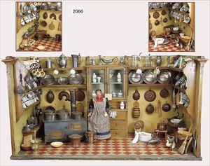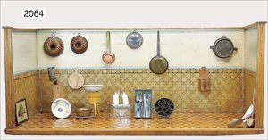 Puppenstubenküche, um 19 Jhd. 1,2 m breit, 43 cm hoch, schöne Einlegearbeit am Boden, reichhaltiges Zubehör, ohne Herd