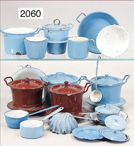 Konv. Töpfe, blau/weiß emailliert, für größere Küche, oder größeren Puppenküchen-Herd, ca. 10 Teile, dazu 2 Töpfe braun emailliert, guter Zust., Teils kleinere Emaillieabplatzer