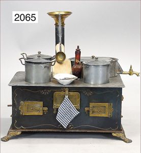 BING Puppenküchenherd, ca. 1910, 30 cm breit, mit Topfsatz und Wasserschiff, Schornstein, Brenner