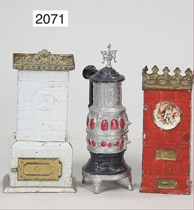 3 Puppenstubenöfen, Zinn, 13,5 cm, mit Krone, Blech handlackiert, 10,5 cm, 1 Blechofen geprägt, 13 cm