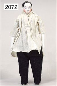 BIEDERMEIER Puppenstuben-Mann, 20 cm, glasierter Brustblattkopf, dunkle ausmodellierte Haare, gemalte Augen, Stoffkörper, glasierte Porzellan-Arme u. -Beine, flache Füße, schöne Gr. f. frühe Küche o. größere Puppenstube