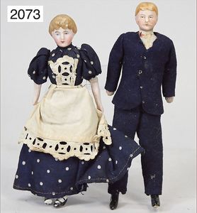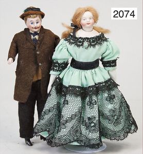 2 Puppenstubenpuppen, Mann, 14,5 cm, Biskuit-Brustblattkopf, gemalte Augen, modellierte Haare, anmodellierter Schnurrbart, Biskuit-Arme u. -Beine, Stoffkörper, alte Kleidung, Dame, 15 cm, Biskuit-Kurbelkopf, auf Biskuit-Brustblatt, Stoffkörper, Biskuit-Arme u. -Beine, Kleid als o. aus alten Stoffen genäht