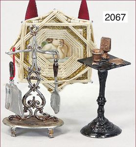 3 Teile Puppenstubenzubehör, Zinn, Rauchertisch, 7 cm, 1 Kamingarnitur, Hacken fehlt, 1 Puppenstubenbild