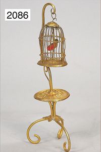 ERHARD & SÖHNE Messing/Blech vergoldet, Vogelkäfig mit Wachsvogel, 19 cm, für herrschaftl. Puppenstube, filigran gearbeitet