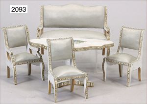 Puppenstuben-Sitzgruppe, Frankreich, passend zu Faltgehäuse, Tisch 13 cm, Bank, 3 Stühle, Seidenbezug, guter Zust.