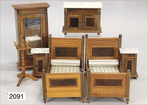 Konv. Schlafzimmermöbel, Spiegelschrank, Höhe 23,5 cm, 2 Betten, 25,5 cm, 2 Nachttische, Nachttischschrank, 1 Garderobenständer, um 1890, passend zu Pos. 2085
