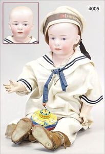 außergewöhnliche Biskuitporzellan-Kurbelkopf-Charakterpuppe, Knabe, 26 cm, Ganzbiskuit, blaue gemalte Augen, leicht off./geschl. Mund, ausmodellierte Haare, außergewöhnlicher Drehkopf, bewegliche Arme und Beine, Körper gemarkt 243-23., Kopf zum Körper größenmäßig passend, Halspfanne sitzt nicht gut