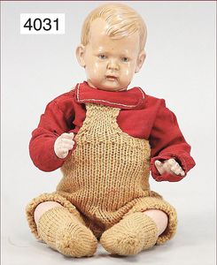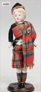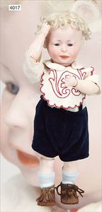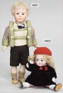 Ganzbiskuitpuppe, 17 cm, Kurbelkopf, blaue fest eingesetzte Glasaugen, geschl. Mund, Mohairperücke, bewegliche Arme und Beine, anmodellierte Schuhe und Strümpfe