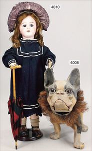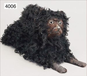 Bully, Papiermaché, um 1900, 45 cm, Orig.-Halskrause, Kratzstimme mit Zugmechanismus, beim Öffnen des Mauls, kleinere Abriebstellen sonst insgesamt schöner Orig.-Zust.
