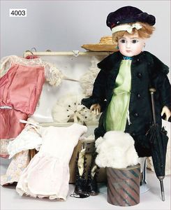 STEINER kl. franz. Biskuit-Porzellankopfpuppe a.7, 36 cm, gepresster Biskuitkopf, blaue fest eingesetzte Paperweightaugen, geschl. Mund, durchst. Ohren, franz. Gliederkörper, alte Kleidung, Schuhe und Strümpfe, alte Mohairperücke, alter Papiermarché-Kopfdeckel, dazu ein Trousseau Koffer mit Kleidung, sehr schöne Stiefel mit Absatz, Schirm, Hut, Kleinteile, schöne Größe