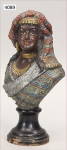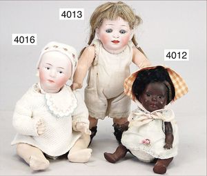 farbige Babypuppe, gespritztes Porzellan, Kurbelkopf, braune fest eingesetzte Glasaugen, Mohairperücke, off.-geschl. Mund, Sitzbabykörper