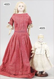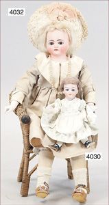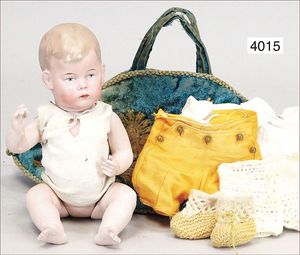 KESTNER 143 Biskuit-Porzellankopfpuppe, 51 cm, Kurbelkopf, blaue Schlafaugen, off. Mund, oben Zähne, Gipsdeckel wurde nicht entfernt, (Transportrisiko für Augenmechanismus beachten), alte Mohairperücke etwas ausgegangen, Gliderkörper, alte Unterkleidung, Schuhe und Strümpfe