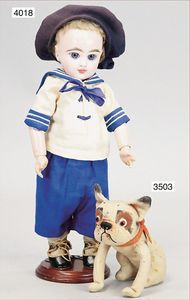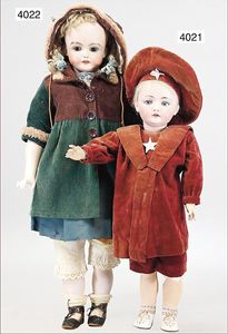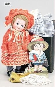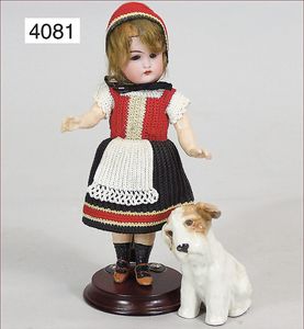Biskuitporzellankopf-Puppe, wohl Simon & Halbig, 18,5 cm, braune Schlafaugen, off. Mund, oben Zähne, Masse-Stehkörper, mit anmodellierten Schuhen u. Strümpfen, Orig.-Kleidung gehäkelt, Orig.-perücke wurde nicht entfernt, von außen keine Risse erkennbar, Transportrisiko für Augenmechanismus beachten, dazu passend kl. Keramik-Hund, 8 cm