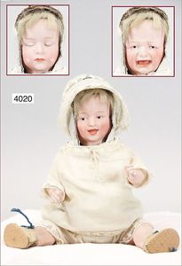 Zwei-Gesichterpuppe, Papiermaché, Wachs überzogen, fest eingesetzte Glasaugen, schlafend gemalte Augen, Zugstimme u. Zugdrehmechanismus, Stoffkörper, Masse-Arme u. –Beine, guter Zust., 38 cm