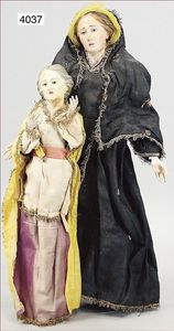 2 neapolitanische Puppen, Sakral, Madonna, 55 cm, fest eingesetzte Glasaugen, mit Füßen, eine Stabfigur, 44 cm, altersbedingte Lackabplatzer
