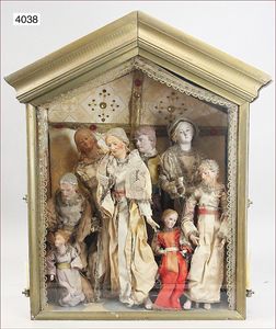 Vitrine mit sakralen Terracottapuppen, wohl neapolitanisch, 70 cm hoch, 58 cm breit, 7 Puppen, 26 bis 46 cm, alte Bemalung, altersbed. kl. Beschädigungen an den Händen, Lackabplatzer, Spannungsrisse