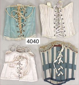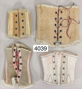 Konv. Häubchen u. Mieder, 1 x frühes Häubchen, schöner orig.-Zust., blau/beige, mit Spitze, für mittelgr. Puppe geeignet, 14 cm breit, 1 x hellblaues Häubchen, mit Spitze- u. Seidenbesatz, Durchm. 10 cm, Mieder, zartrosa, Breite 14 cm, Höhe 12 cm, für mittelgr. Bebe geeignet, schönes Konv.