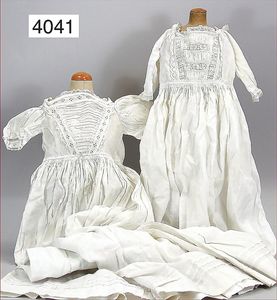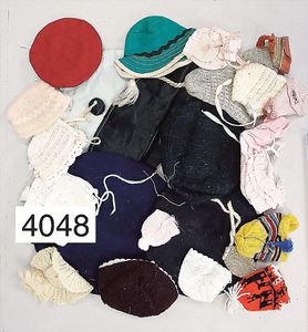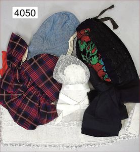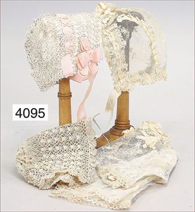 Konv. franz. Puppenhäubchen, 1 x Spitzenhaube, innen mit weißem Seidenbesatz, zarte rosé farbene Seidenschleife, 12 cm, sehr schöner Orig.-Zust., dazu 1 gehäkelte Haube, 1 x franz. transparentes Häubchen, mit Spitzen- u. Seidenbesatz, dazu passend transparentes Spitzenhemdchen, sehr schönes Konv.