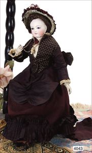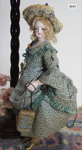 JUMEAU Modepuppe, Biskuitporzellan-Kurbelkopf-Puppe, Biskuitporzellan-Brustplatte, blaue fest eingesetzte Paperweight-Augen, geschl. Mund, durchst. Ohren, Lederkörper mit Zwickeln, gegliederte Holzarme, alter Korkdeckel, braune Echthaarperücke mit Flechtfrisur, ca. 40 cm, Bluse sowie Rock teilw. aus alten Stoffen genäht, Haube neuer, dazu eine schöne Perlentasche, fliederfarben, mit integriertem Taschenmesser, lederne Stiefel mit Absätzen, vermutlich neuer