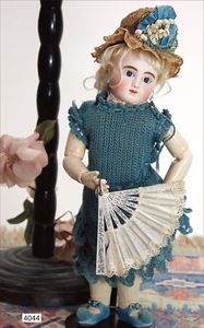 JUMEAU frühe Primére Jumeau, 1. Serie, franz. Bébé, Biskuitporzellan-Kurbelkopf-Puppe, gem. Nr. 6, große Anzahl an ausgefallener alter passender Kleider, blaue, fest eingesetzte Strahlenaugen, geschl. Mund, durchst. Ohren, sehr helles Porzellan, fein schattierte Augenlider, franz. Gliederkörper, frühe ausmodellierte Hände, mit festen Handgelenken, 8 lose Kugeln, sehr schöner Zust., alter Korkdeckel, blonde, lockige unberührte Mohairperücke, alte schöne Kleidung u. Unterkleidung, lilafarben mit mintfarbener Seide, schöner Orig.-Zust., Kleid absolut unberührt und orig., alte orig.-Jumeau Schuhe, 40 cm, dazu kl. Eiertasche, Leder, innen mit Häkelutensilien, blaue Seide, ausgefallen, absolutes Spitzenstück, extrem selten