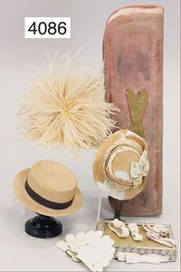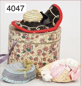 Konv. Puppen-Ausschmückungsteile, 2 Hüte, darunter Wilhelm Hutfabrik Emisora, Kopfdurchm. 6 cm, einige Puppenstrapse, 1 Fächer Bein, in Schatulle, Randbezogen