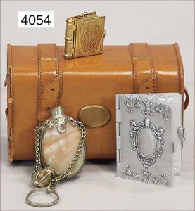 hölzener Trousseau, mit Druckverschluss, 10 cm breit, 5 cm hoch, seitl. an den Rändern vereinzelte Stellen weggebrochen, innen blaue Seide, mit ausgefallener silberner Trinkflasche, Hinter- u. Vorderseite mit Perlmuteinlegeplättchen, 4 cm, 1 Erhard & Söhne Klapp-Bilderalbum, schönes Beistellwerk