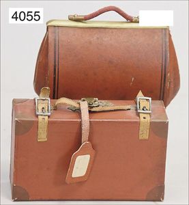 Konv. 2 Reisekoffer, Papiermaché, mit bunt lithogr. Papier beklebt, mit 2 Trageriemen, 11,5 cm breit, 7 cm tief, 7 cm hoch, beide in schönem Zust., mit Stoffresten gefüllt