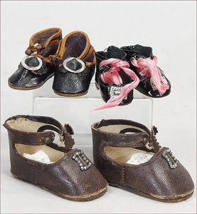 Konv. 3 Puppenschuhe, 1 x dunkelbraune Puppenschuhe, Gr. 9, gemarkt FN, schwarze Schuhe, Gr. 4, 1 x schwarze Lackschuhe