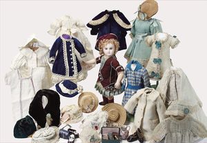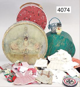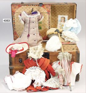 franz. Trousseau, Holz mit Eisenbeschlägen, innen mit Einsatz, separates Fach im Deckel, 40 cm breit, 24 cm tief, 28 cm hoch, mit reichh. Kleidern, passen zu franz. Bebe, 1 franz. Fabrikkleid, beige, mit fliederfarbenen Stickereien, für ca. 40 cm Puppe geeignet, dazu einige franz. Hauben, versch. Kleider, Mäntel, untersch. Hüte, 1 Flanierschirm, mit Griff Bein, ausgefallen