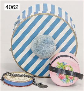 Konv. Papiermaché-Dosen, mit lithogr. Papier beklebt, 1 gr. Hutdose, Durchm. 11 cm, blau/weiß gestreift, 1 Biedermeier Dose rosa, 1 flache Dose, 4,5 cm Durchm., Aufschrift Baptème de ma poupée