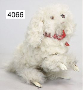 Echtfellhund, Automat, Holzfüße, sitzend, mit Schlüssel, auf und ab hüpfend, 13 cm hoch, lockiges Fell, Glasaugen