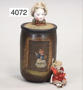 ausgefallene Holzdose, handbemalt, Kindermotiv, Deckel mit Biskuitkopf, blaue gemalte Augen, geschl. Mund, mit Orig.-Korkdeckel u. Perücke, 23 cm hoch, Durchm. 10 cm, ausgefallen, früh, mit kl. Ganzbiskuit-Püppchen, blaue gemalte Augen, ausmodellierte Schuhe u. Strümpfe, 8 cm