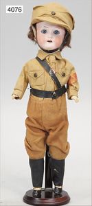 Biskuitporzellankopf-Puppe, Heubach 250, 34 cm, blaue Schlafaugen, off. Mund, oben Zähne, Kinngrübchen, Masse-Stehkörper, Orig.-Kleidung, als Hitler-Junge