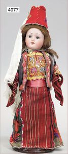 HERMANN STEINER Made in Germany, Gr. 5, Biskuitporzellankopf-Puppe, 32 cm, braune Schlafaugen, Puppe hat einen leichten Silberblick, off. Mund, oben Zähne, Kinngrübchen, Masse-Stehkörper, Orig.-Trachtenkleidung, Orig.-Perücke