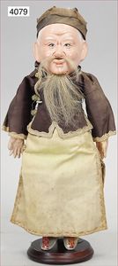 asiatischer Händler, 30 cm, Masse-Einbindekopf, gemalte Augen, eingesetzter Schnurrbart, Stoffkörper, Masse-Arme u. –Beine