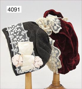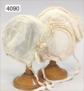 Konv. 2 Häubchen, 1 x Baumwoll-Häubchen, mit Spitzen- u. Seidenbesatz, 1 x bordeauxrote franz. Haube, mit Spitzenbesatz, geeignet für größere Puppe, Durchm. ca. 12 cm
