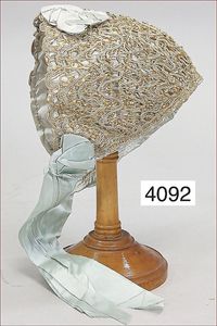 frühes ausgefallenes Häubchen, Strohhäkelmuster, innen mintfarbene Seide, geeignet für franz. gr. Puppe, Durchm. ca. 17 cm, Endstücke mit Seidenbandbesatz, unberührter Orig.-Zust.