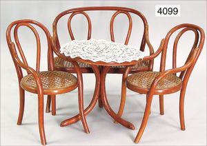 THONET Sitzgruppe, ca. 1910, Bank, 36 cm breit, 33,5 cm hoch, 1 Tisch Durchm. 25,5 cm, 2 Stühle, schöne Puppendekoration, für ca. 45 cm Puppen