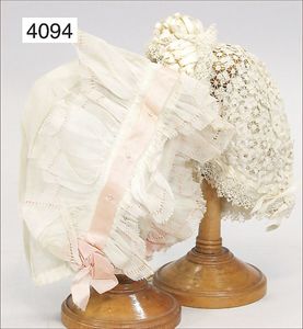 ausgefallenes franz. Häubchen, für gr. Puppe, aus Spitze, mit Seidenschleifenbesatz, Breite 16 cm, dazu 1 Stoffhaube (Kinderhaube), für gr. Puppe, mit roséfarbenem Seidenbesatz, transparent