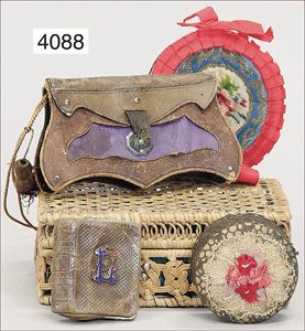 2 Teile Puppentaschen, 1 x Leder, 11 cm, 1 x Leder mit Emaille-Initialen, 5 cm, 1 kl. Puderschatulle, innen verspiegelt, 1 Ballzierde bestickt, mit rotem Seidenrand, in kl. Schatulle, Korbgeflecht