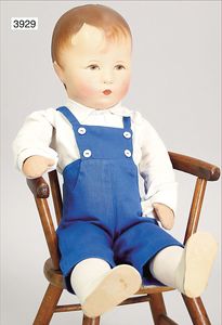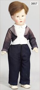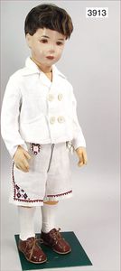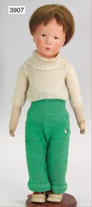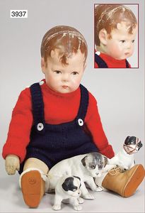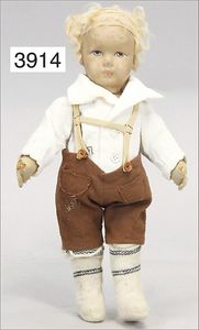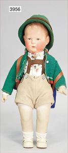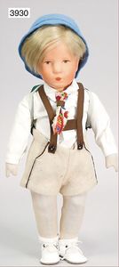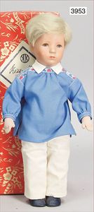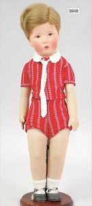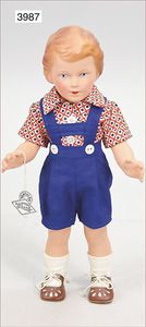 KÄTHE KRUSE Junge, Puppe Nr. 1X, 35 cm, Kunststoffkopf, Trikotkörper, blaue gemalte Augen, Orig.-Perücke, sehr guter Zust., Orig.-Kleidung, Orig.-Kart., leichte Abriebstelle durch Lagerung auf der Nasenspitze, sonst nahezu unbespielt