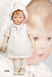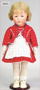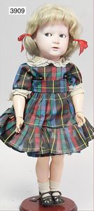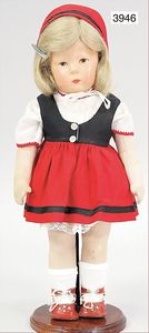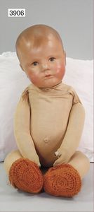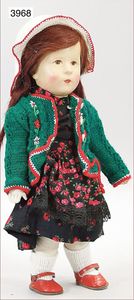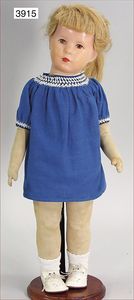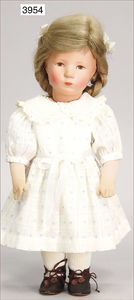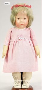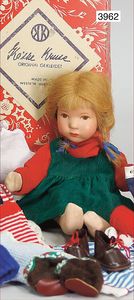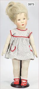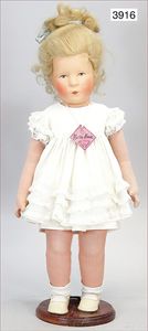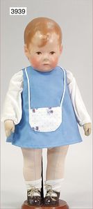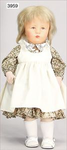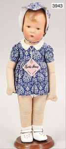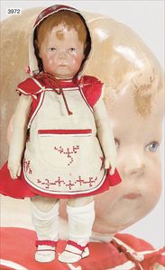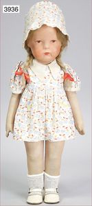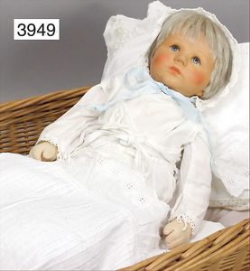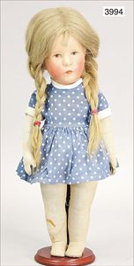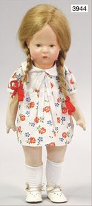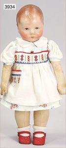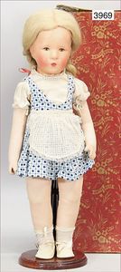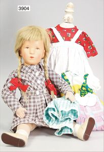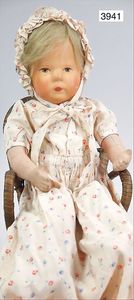 KÄTHE KRUSE deutsches Kind, Mädchen, Ilsebil, 50 cm, Stoffkopf, Hinterkopfnaht erst unter der Perücke erkennbar, braune gemalte Augen, Orig.-Perücke, Trikotkörper, ein wenig Farbabrieb auf der Nasenspitze, mit zusätzlicher Kleidung aus der Zeit, Stoffkragen am Hals mit Farbabweichung, Einlieferung aus einem Privathaushalt, die Puppe wurde damals an ein Kind verschenkt, dessen Bruder aus Neid das deutsche Kind auf den Boden geworfen hat, danach wurde die Puppe zu Käthe Kruse eingeschickt und ein neuer Kopf montiert