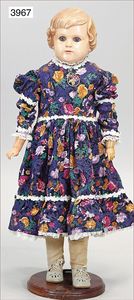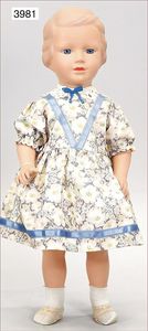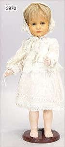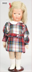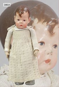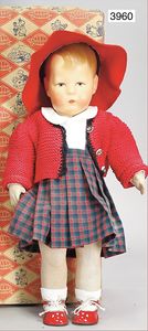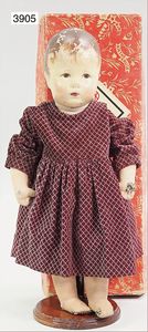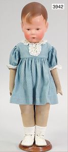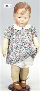KÄTHE KRUSE Schaufensterpuppe, Friedebald, 50er Jahre, 88 cm, Magnesitkopf, Orig.-Perücke, 2 kl. Spannungsrisse seitl., sonst schöne Bemalung, Körper stärker bespielt, an den Händen berieben, Draht an 1 Arm lose, alte Kleidung u. Schuhe
