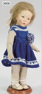 KÄTHE KRUSE Puppe Nr. VIII, Stoffkopf, braune gemalte Augen, deutlich sichtbare Hinterkopfnaht, Orig.-Perücke, Orig.-Trikotkörper, mit leicht abgeknickten Beinen, abgenähte Kniekehlen, alte Kleidung, Rock u. Uhr jünger, kl. Stellen am Körper etwas eingerissen, Bemalung bis auf minim. Krakeleelinien gut