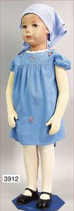 KÄTHE KRUSE Schaufensterpuppe, Mädchen, 95 cm, 50er Jahre, Magnesitkopf, seitl. blickende blaue gemalte Augen, ähnlich Schielböckchen, wohl für den italienischen Markt, Trikotkörper, ohne Perücke, Körper an den Daumen berieben, alte Kleidung u. Schuhe