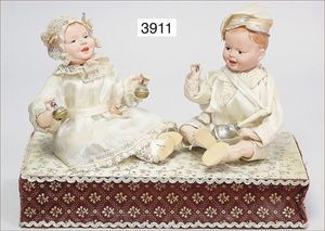 SCHILKRÖT in Raute, Einbindekopf, mit Musikdruckspielwerk, 2 Kinder, mit Bewegung der Arme, untersch. Gesichtszüge, Mädchen u. Junge, 2 Glocken fehlen, sonst sehr guter Zust., 27 cm lang, 13 cm tief, 20 cm hoch, selten, schöner Orig.-Zust.