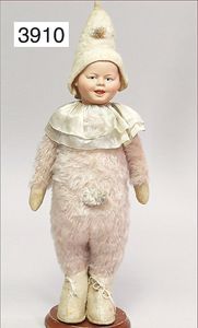 SCHILDKRÖT in Raute, Einbindekopf, seltener Junge, mit rosa Mohairkörper, Mohair an vereinzelten Stellen etwas berieben, Filzbeine sowie Filzhut, blaue gemalte Augen, off./geschl. Mund, oben 2 Zähne, Zunge, 36 cm