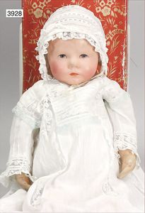 SCHILDKRÖT Typ Käthe Kruse, Tortulon, 35 cm, fester Kopf, leicht seitl. geneigt, blaue Glasaugen, ausmodellierte Haare, bewegl. Arme u. Beine, Orig.-Kleidung, guter Zust.