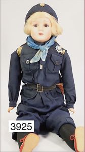 SCHILDKRÖT Brustblattkopf-Puppe, Celluloid, 70 cm, braune Schlafaugen, off. Mund, oben Zähne, Kinngrübchen, Mohairperücke wurde nicht entfernt, Transportrisiko für Augenmechanismus beachten, Wachstuchkörper, Celluloid-Arme, schöne alte Jungenkleidung, als Pfadfinder
