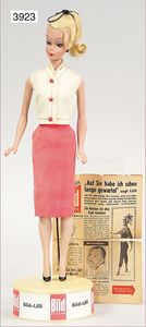 HAUSSER Bild Lilli, gr. Größe, guter Zust., minim. Abriebstellen an dem schwarzen Wimpernkranz, blonde Haare in gute Zust. Stiftrock mit dazu passender beiger Bluse, Stiftrock etwas ausgeblichen, auf Bildpodest, Stab wohl 1 x ergänzt, dazu 1 Zeitung, Lilly Bild Zeitung, auf Sie habe ich schon lange gewartet, sagt Lilli